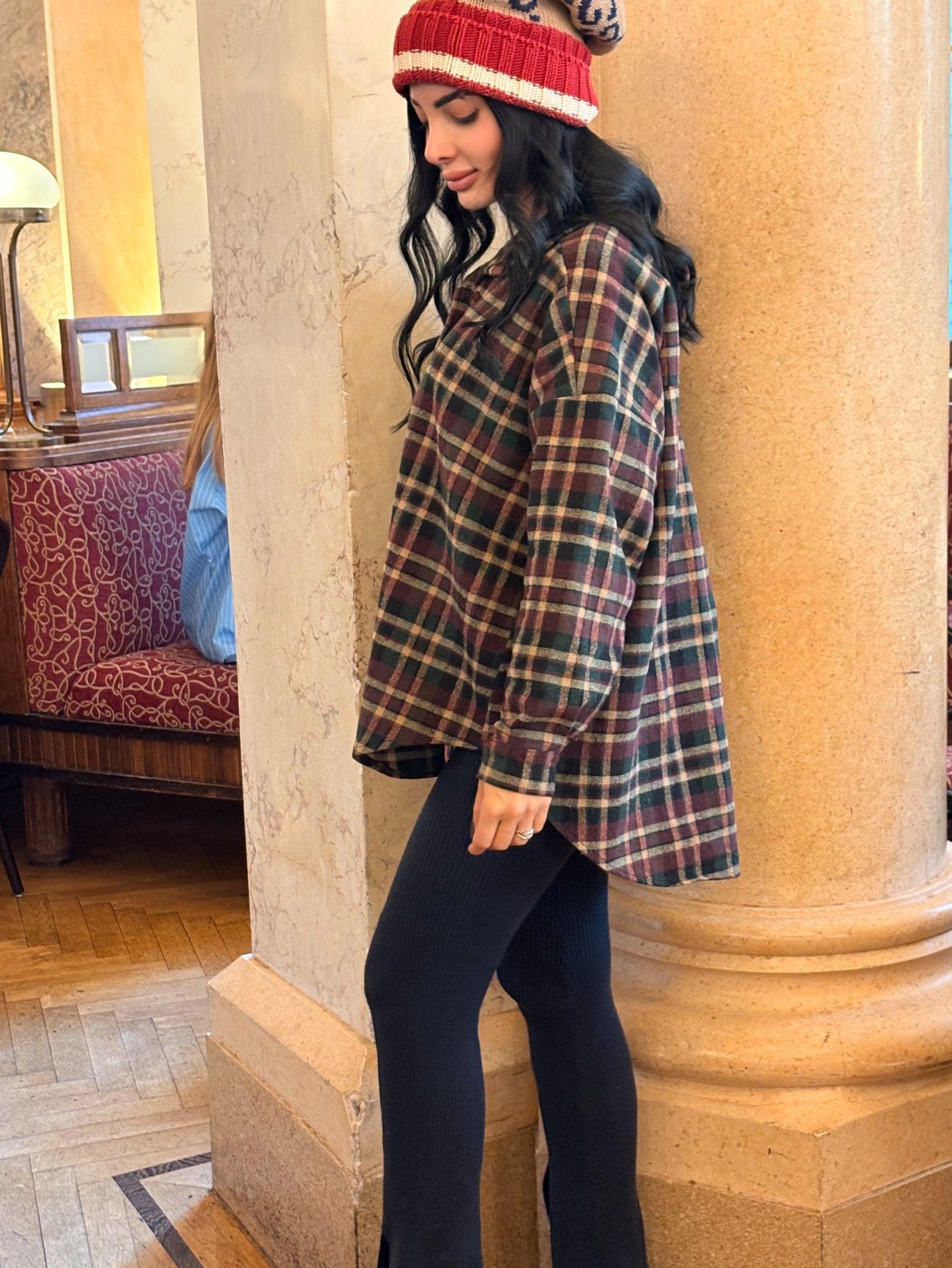 Aggiungi un tocco cozy e trendy ai tuoi outfit con la Camicia Oversize Scozzese – Bordeaux & Verde, un capo morbido, caldo e perfetto per la stagione.