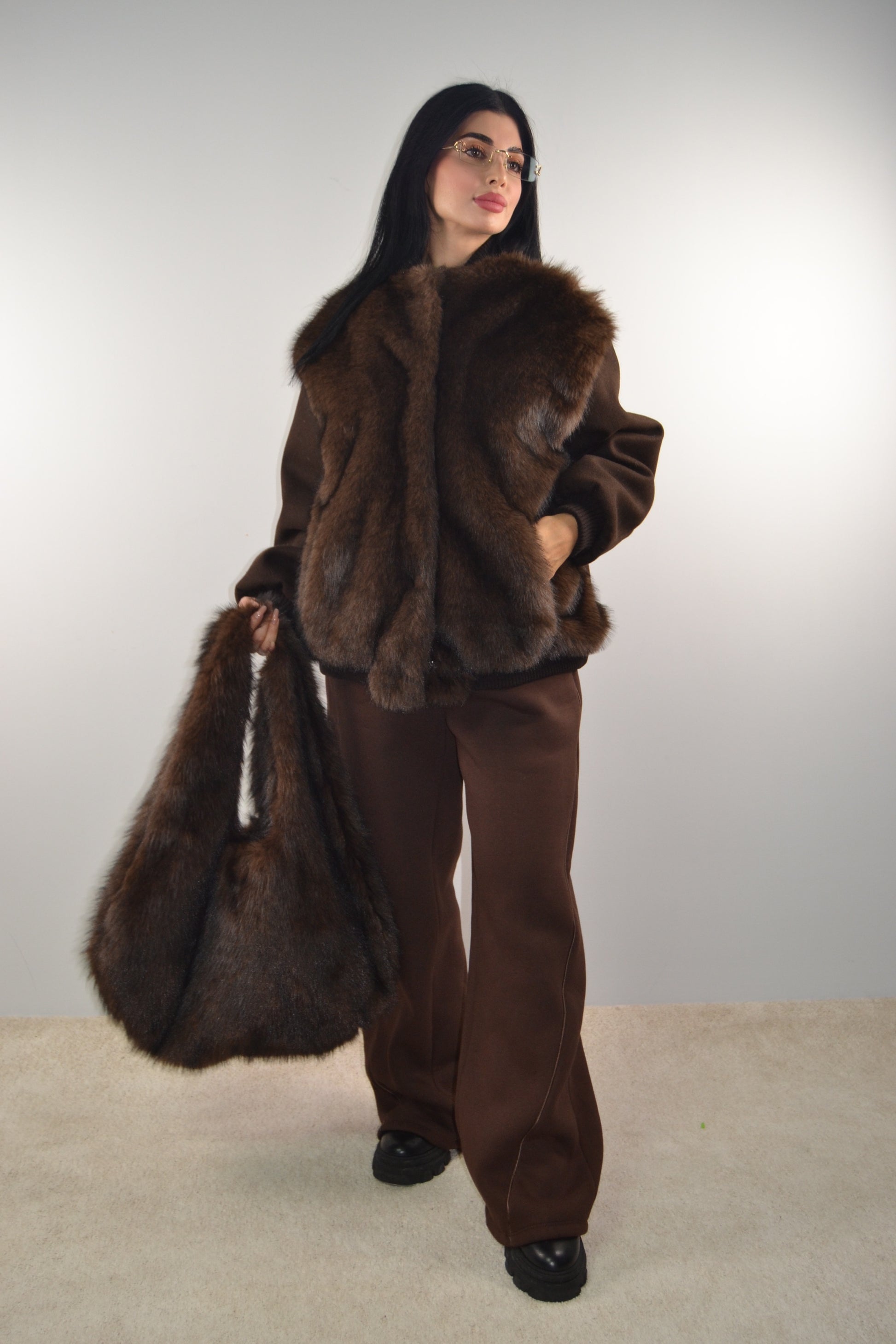 La parte principale del cappotto è realizzata in morbida eco-pelliccia premium effetto volpe, mentre le maniche in tessuto cappottino donano struttura e originalità, creando un mix perfetto tra eleganza e comfort.